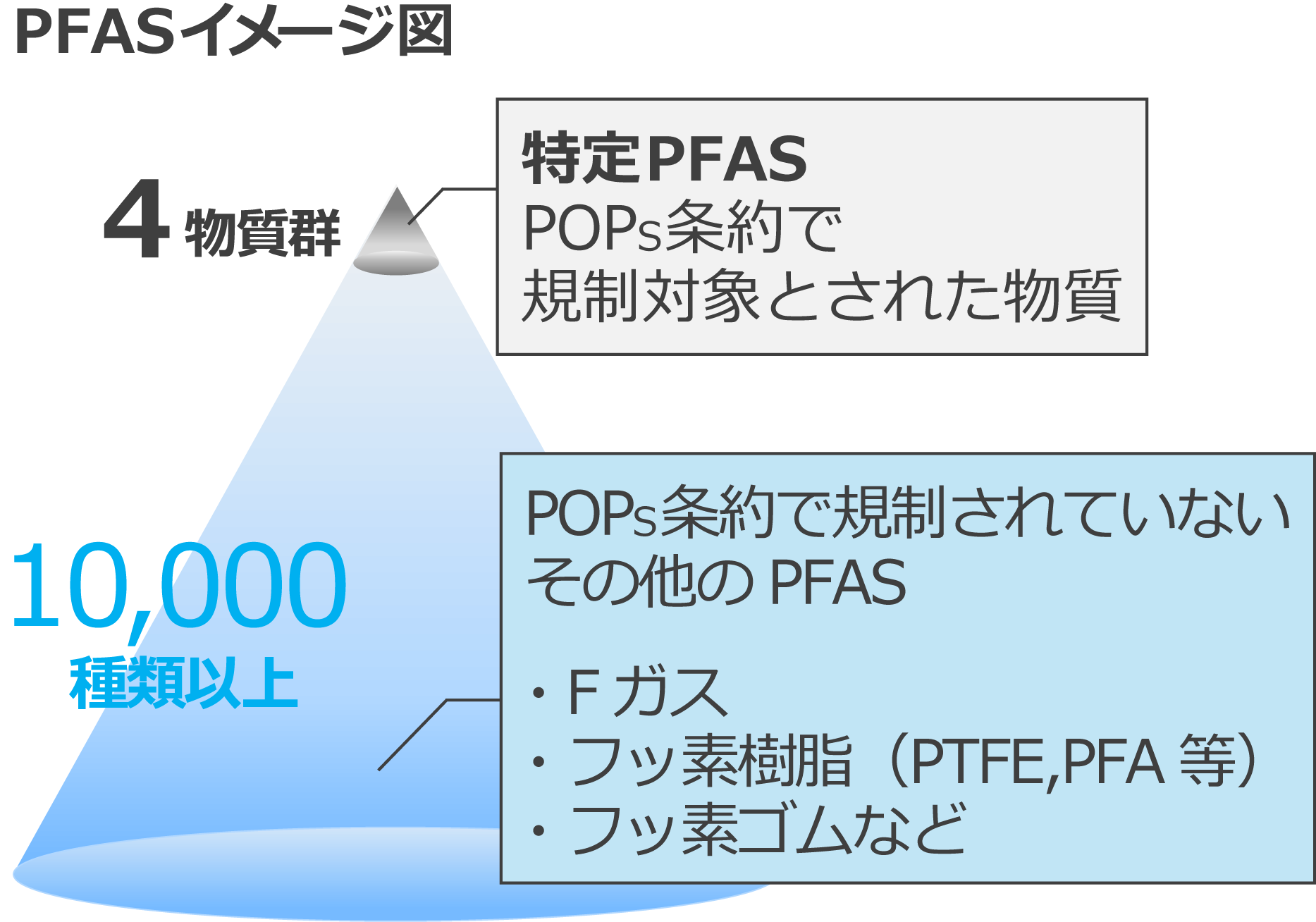 FCJでは、国連の「POPs条約(残留性有機汚染物質に関するストックホルム条約)」で規制対象とされた一部の有機フッ素化合物を特定PFAS(ピーファス)と呼ぶことを提唱しています。2025年9月時点では、以下の4物質群の塩及びその関連物質が特定PFASです。